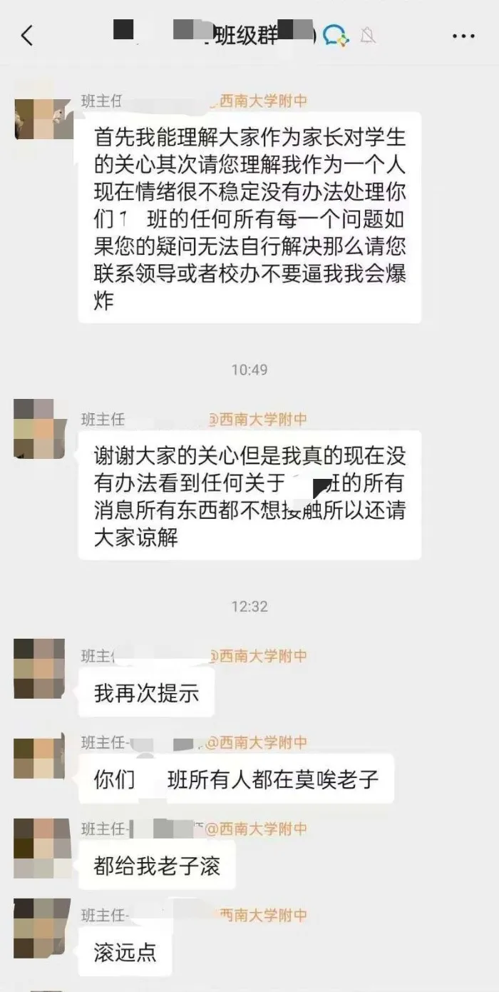 10月14日,多张群聊截图显示,一个疑似有88名群成员的西南大学附属中学一班级群里,“班主任徐某某老师”疑似情绪崩溃大发脾气。