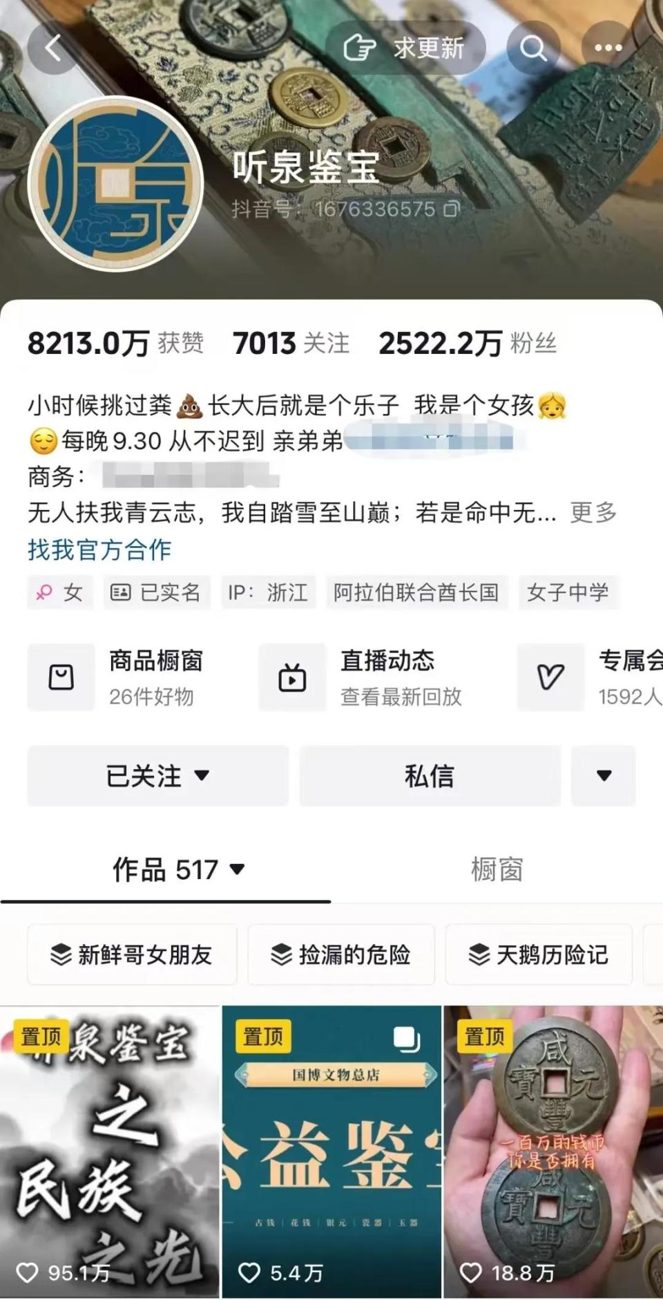 作为一位鉴宝博主,“听泉鉴宝”此前的直播内容为连线粉丝,为粉丝鉴定“宝贝”是否值钱,如果是真的的话,再预估“宝贝”大概值多少钱。据第三方数据平台显示,其近30天内,该账号涨粉959万。目前,其在抖音平台的粉丝数超2500万,获赞量达8200多万。