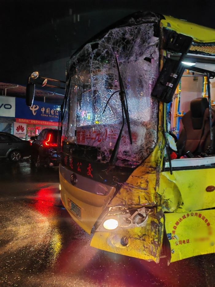 10月15日,目击者何先生向大皖新闻记者介绍, 14日晚上7点左右,在荔浦市马岭镇一处道路,这辆公交车到站后,正在下客,突然一辆油罐车驶来,车尾与公交车头发生碰撞,导致公交车出现旋转位移,在此过程中,与两辆私家车碰撞。事发时,公交车内还有乘客。