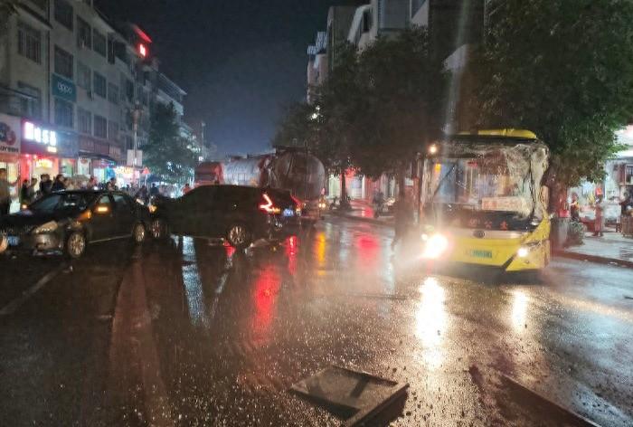 视频画面显示,夜幕下,正下着雨,一辆车头受损的公交车斜停在路中间,旁边是一辆车尾已出现变形的油罐车,中间还有两辆不同程度碰撞受损的私家车,现场散落着不少玻璃和零件碎片,引起了群众围观,随后有救护车到场。
