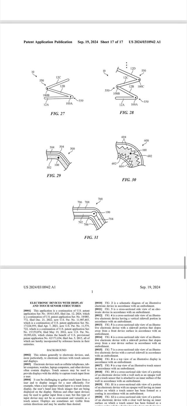 据智慧芽搜索到的素材,苹果公司今年9月19日公布了名为“具有显示和触控感测器结构的电子装置”的专利,专利公开号为US20240310942A1。苹果还在这份专利文档中,展示了将该技术应用于三折手机与四折手机的图片。