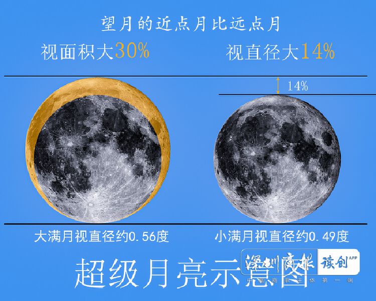 同样是满月,近地点比远地点的满月视直径大14%,视面积大30%,视亮度大30%左右(见超级月亮示意图)。