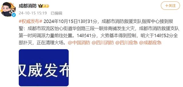 成都消防随后发布通报:10月15日13时31分,成都市消防救援支队指挥中心接到报警:成都市双流区怡心街道华剑路三段一联排商铺发生火灾,成都市消防救援支队第一时间调派力量前往处置。14时41分,火势基本得到控制,明火于14时52分全部扑灭,正在清理火场。