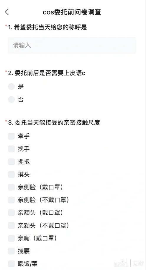 约会倒计时72小时,“男友”给莫娜准备了一份详细的调查问卷——“希望我当天如何称呼你?”选项:“女朋友、宝宝、昵称”;“希望当天相处是什么状态?”选项:“暧昧期、热恋期、老夫老妻”;“可以接受的肢体接触有哪些?”选项:“贴脸、拥抱、隔着口罩亲亲”……大到相处方式、小到昵称,20多个选项问题,涵盖了约会的方方面面。