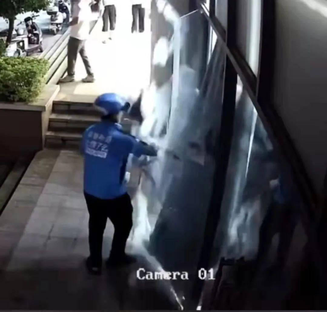 近日,有网友发视频反映,广东惠州一外卖小哥送餐进入一店家玻璃门时,玻璃门突然碎裂,小哥手臂被划伤,门店要求外卖小哥赔偿600元。监控视频显示,该玻璃门有两扇,上面挂有一把U型锁,门内的帘子关了一半多,灯光外露较少。