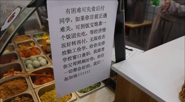“标语贴了一个多月了,遇到一些学生确实有困难的,我会给他们找可以做兼职的地方,管他们饭。走红是个意外,我不想红,我就想把这件事坚持下去……”10月16日,张贴这则告示的河南师范大学“饭宝饱”店主张先生告诉记者。