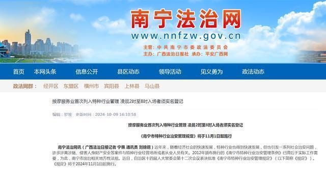 值得关注的是,新版《规定》首次将“按摩服务业”列入南宁市特种行业治安管理范围。新版《规定》要求,按摩服务业经营者对凌晨2时至8时在场所内接受服务的人员,应当如实记录其姓名、住址、身份证件种类和号码等信息。这引发网民关注和讨论。