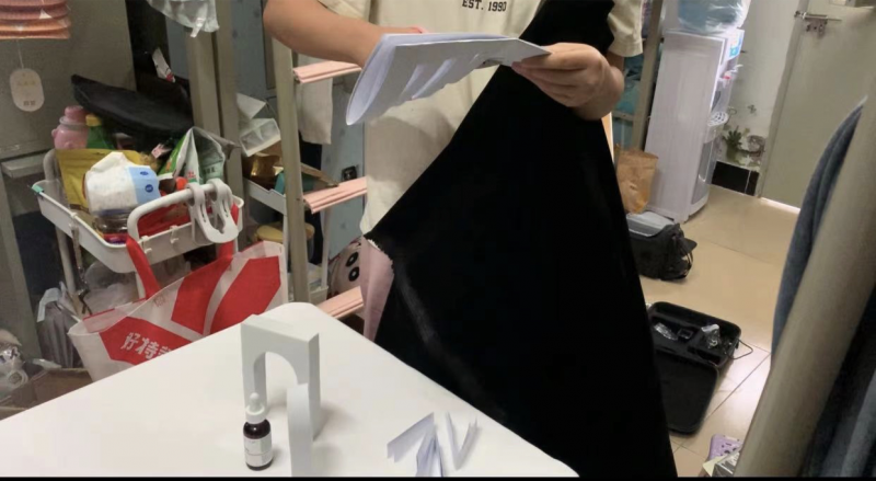 由于小杨的阳台没有窗帘,她们不得不向隔壁寝室借来一块黑色吸光布,并想了好几种办法想要将其固定在门框上,但即便如此,光线依旧过于强烈。她们只能耐心等待,直至天色渐暗,才得以开始拍摄。
