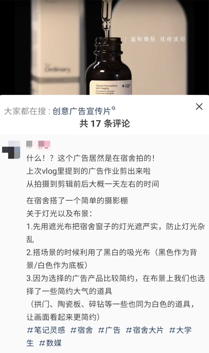 在拍摄精华液广告时,小杨与她的团队同样以几十元的预算,展现出了非比寻常的创意。