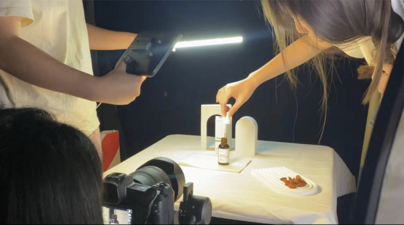 后来,她们选定了一瓶未拆封的精华液。“主要是不需要重新购买,避免浪费时间。当时有一个镜头需要把产品拿起来,产品的崭新状态能够呈现出最佳的视觉效果。所以必须要选个全新的东西拍。”小杨解释。