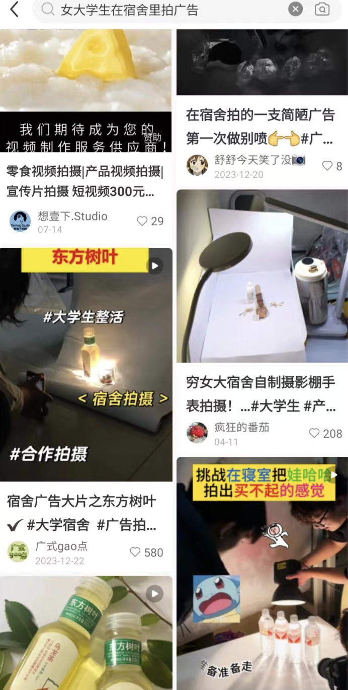 大学生们在宿舍拍广告大片,主打的就是一个“花最少的钱,拍出最震撼的视觉效果”。