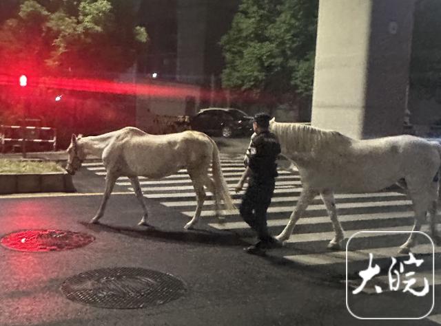 当日凌晨1时许,镜湖公安分局特巡警大队接到110指令:位于镜湖区东外街的东方龙城秉心苑北门附近出现两匹白马。同时,芜湖警方接到报警,称有两匹白马“走失”。