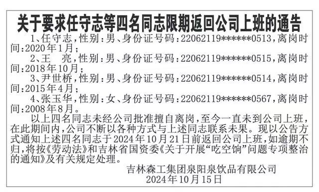 10月15日,吉林森工集团泉阳泉饮品有限公司发布《关于要求任守志等四名同志限期返回公司上班的通告》,称公司有4人擅自离岗。其中一名员工离岗时间为2008年,至今长达16年。