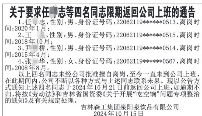 据吉林日报,10月15日,吉林森工集团泉阳泉饮品有限公司发布《关于要求任某志等四名同志限期返回公司上班的通告》。根据通告内容,该公司有4名人员未经公司批准擅自离岗,至今一直未到公司上班,公司不断以各种方式与上述同志联系未果。公司以公告方式通知4名同志于2024年10月21日前返回公司上班,如逾期不归,将按《劳动法》和吉林省国资委《关于开展“吃空饷”问题专项整治的通知》及有关规定处理。