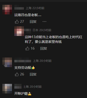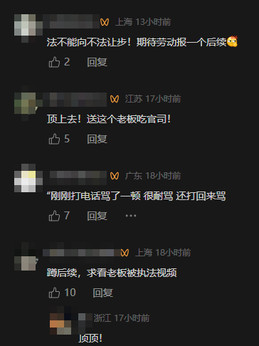 相关评论区中,不少网友对该企业负责人的态度感到愤怒。有网友评论“这种人能当上老板也是吃了时代红利了,要么就是家里有钱”、“开除沪籍”、“法不能向不法让步!期待劳动报一个后续”……