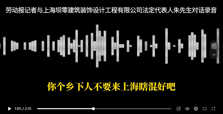 相关录音中,记者拨通上海坝零建筑装饰设计工程有限公司法定代表人朱先生的电话后表明身份,准备采访询问相关事情时,电话被挂断。随后疑似记者再次拨通了朱先生的电话,录音中,朱先生称“我不要任何机会,劳动报都快倒闭了”、“你TM傻子啊你,不骂你你难过了”。