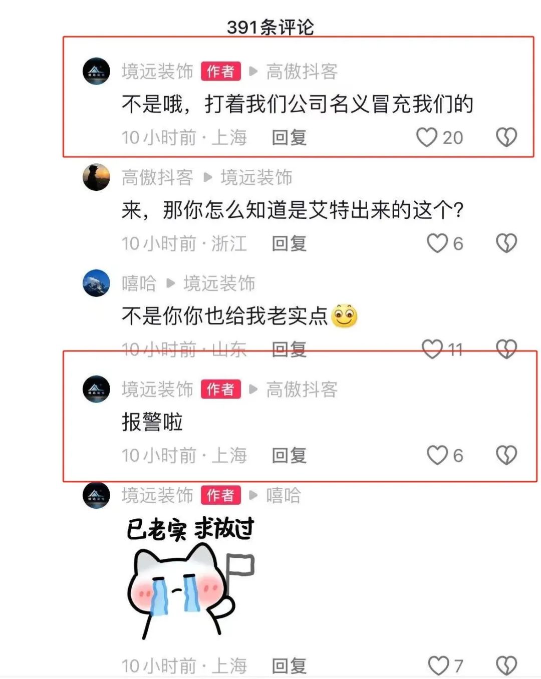 据劳动报10月17日报道,10月16日晚,已有网友找到境远装饰官方抖音账号,留言表达不满,提醒应该向记者道歉。10月17日早,境远公司官方账号回复网友称:“我们也是受害者,朱先生是打着我们旗号冒充的,记者在视频里标注了:上海坝零建筑装饰设计工程有限公司法人朱先生,现在已经报警。”