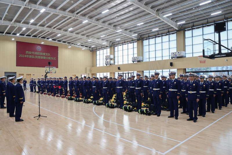 仪式在庄严的国歌声中拉开帷幕,西安市消防支队相关负责人宣读了分配通知,与会领导为新消防员代表、政府专职消防员代表配发了个人装备。随后,新消防员代表、政府专职消防员代表作了表态发言。