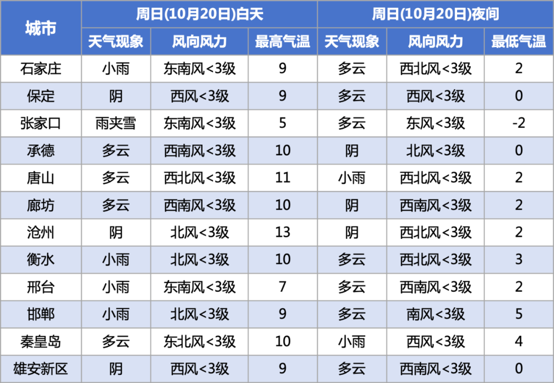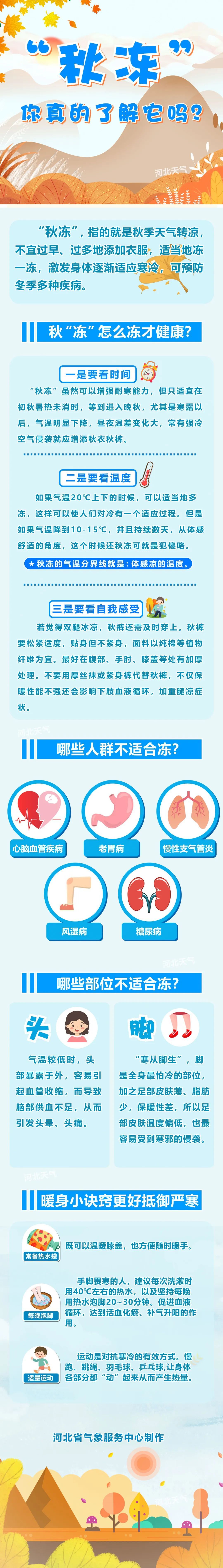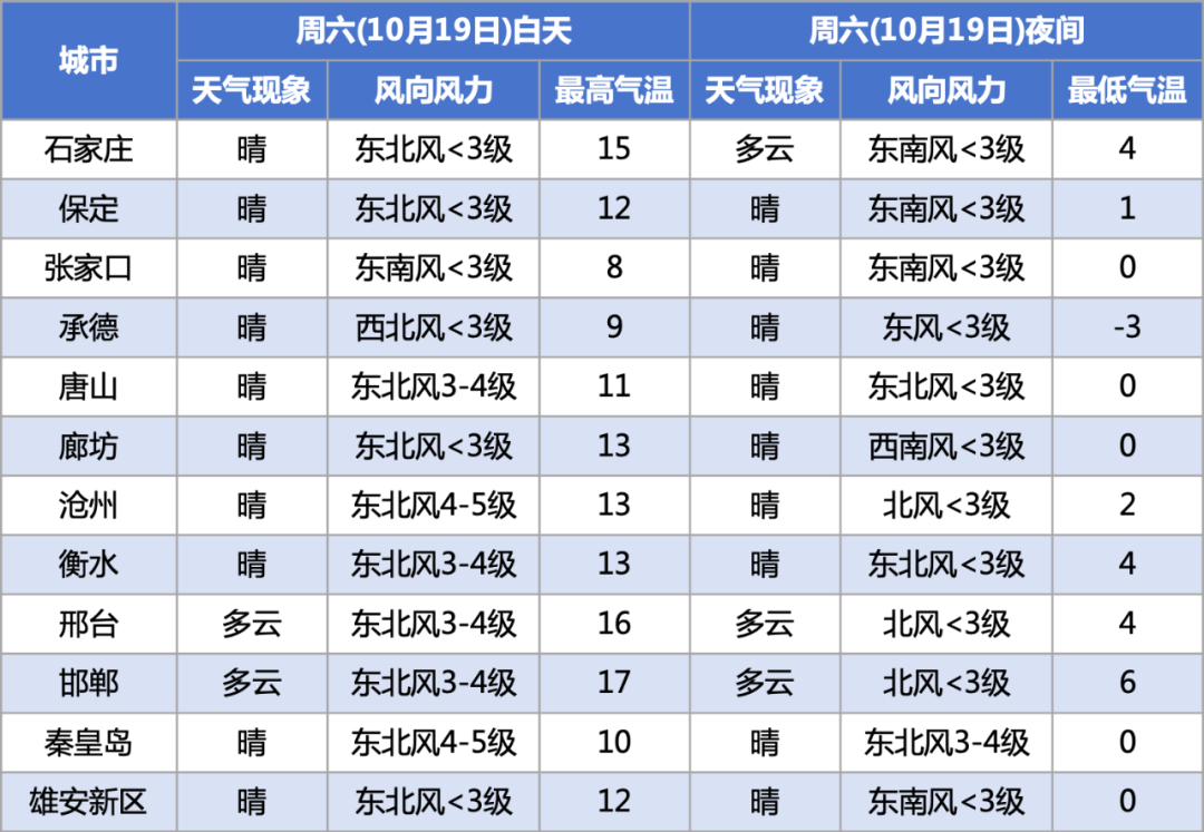受冷空气影响,19-20日早晨,全省大部分地区最低气温明显下降10~12℃,有霜冻,其中张家口、承德下降13~15℃,有冰冻。20日早晨,最低气温坝上地区降至-10~-6℃,其他地区降至-5~4℃。请注意防范!
