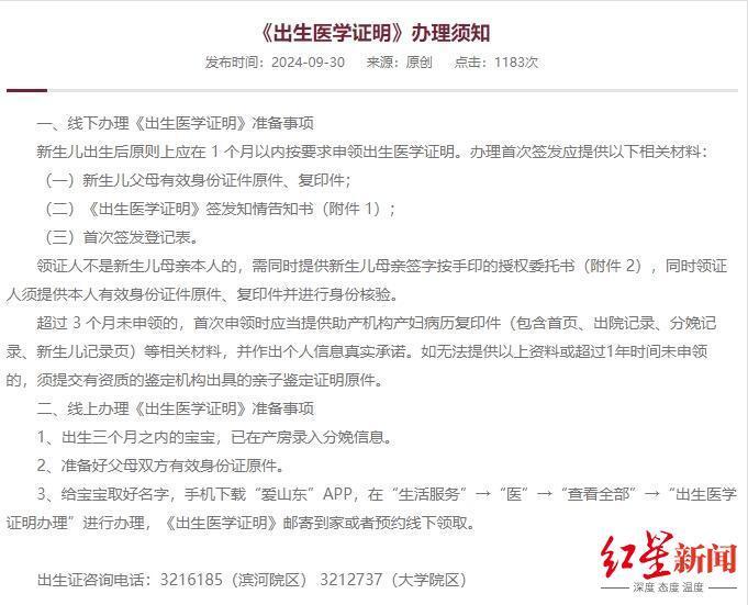 红星新闻在临沂市妇幼保健院官网看到,办理《出生医学证明》规定,需提交新生儿父母有效身份证件原件、复印件;《出生医学证明》签发知情告知书、首次签发登记表。若领证人非新生儿母亲本人,需同时提供新生儿母亲签字按手印的授权委托书,同时领证人提供本人有效身份证件原件、复印件并进行身份核验。