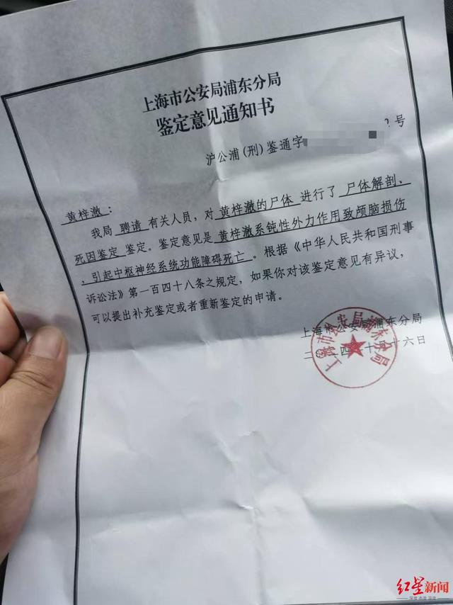 《鉴定意见通知书》显示,浦东分局有关人员对受害儿童黄梓澈进行尸体解剖、死因鉴定。鉴定意见是,黄梓澈“系钝性外力作用致颅脑损伤,引起中枢神经系统功能障碍死亡”。落款日期为10月16日。