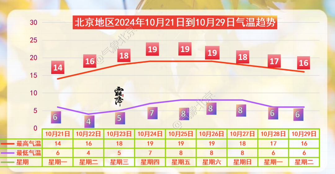 明天迎来新的一周,10月21日夜间及27日白天,会出现两次全市性的弱降水过程。除此之外,其他时间天气都以晴到多云为主,最高气温会回升到14℃~19℃,夜间最低气温4℃~8℃。虽然较本周末寒意有所减弱,但早晚气温依旧低迷,加上正是赏红叶的高峰时期,大家前往山区、郊区游玩可穿着棉衣或薄羽绒服等御寒衣物,谨防感冒和心脑血管疾病。