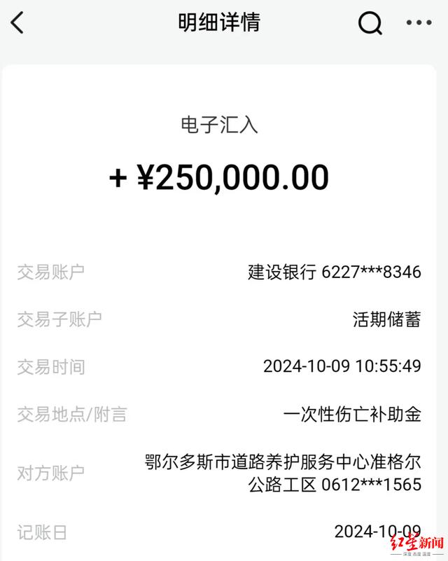 武力丁提供给红星新闻的一份付款截图显示,10月9日,准格尔公路工区向工程队王某明汇入了25万元,备注为一次性伤亡补助金。据裁判文书,准旗人社局也曾在庭上指出,原告准格尔公路工区承认为平息此事,让工程队王某明支付死者家属25万元,系代表准格尔公路工区进行。