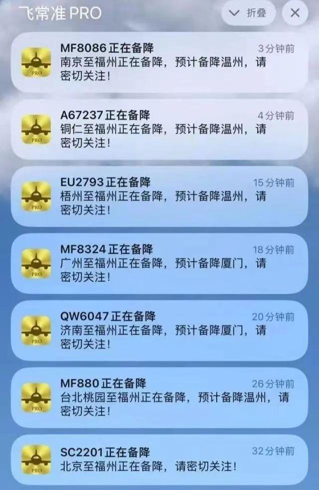 今天(10月21日)下午,多架从无锡、大连、北京等地飞往福州长乐国际机场的航班在空中盘旋后,备降至附近的温州机场和厦门机场。