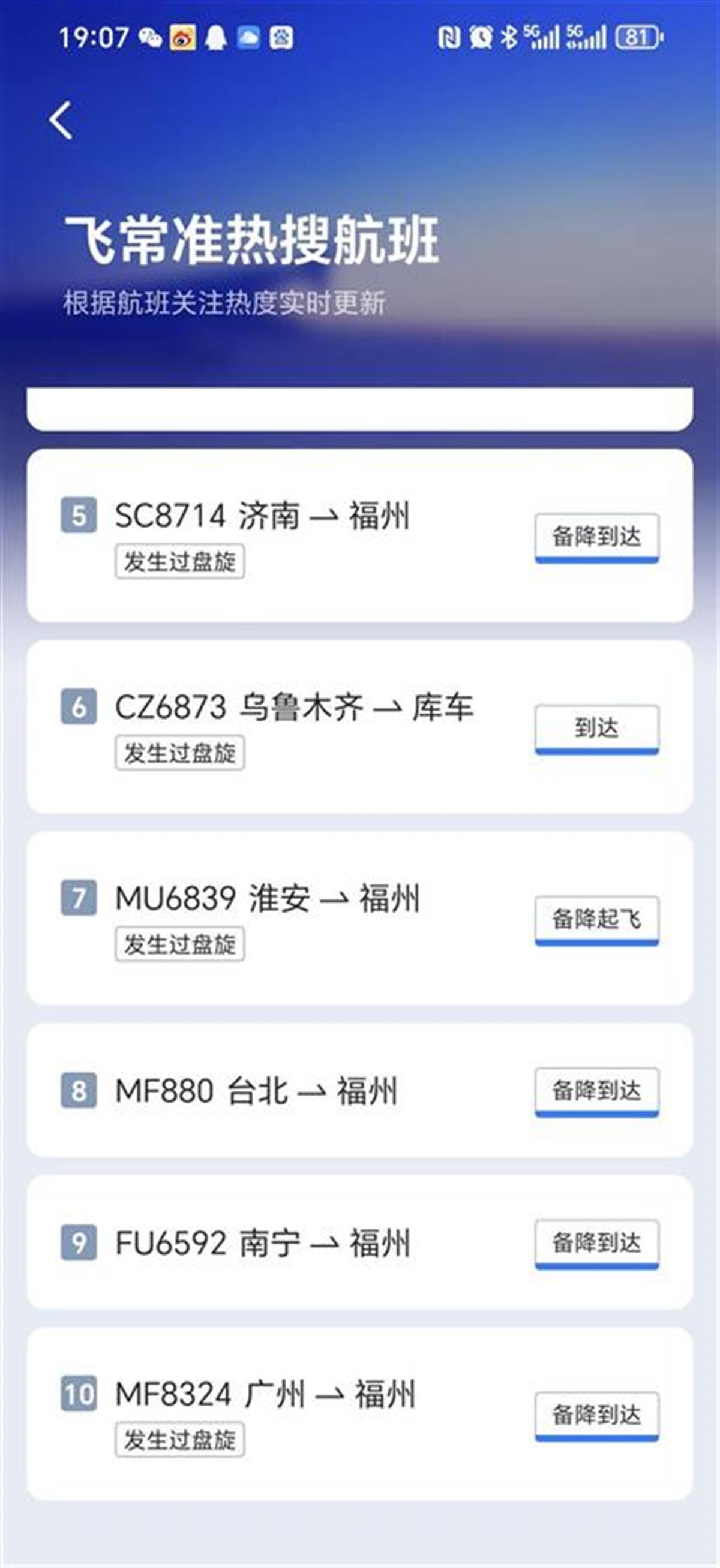 飞常准APP显示备降航班多数已经抵达福州(手机截图)