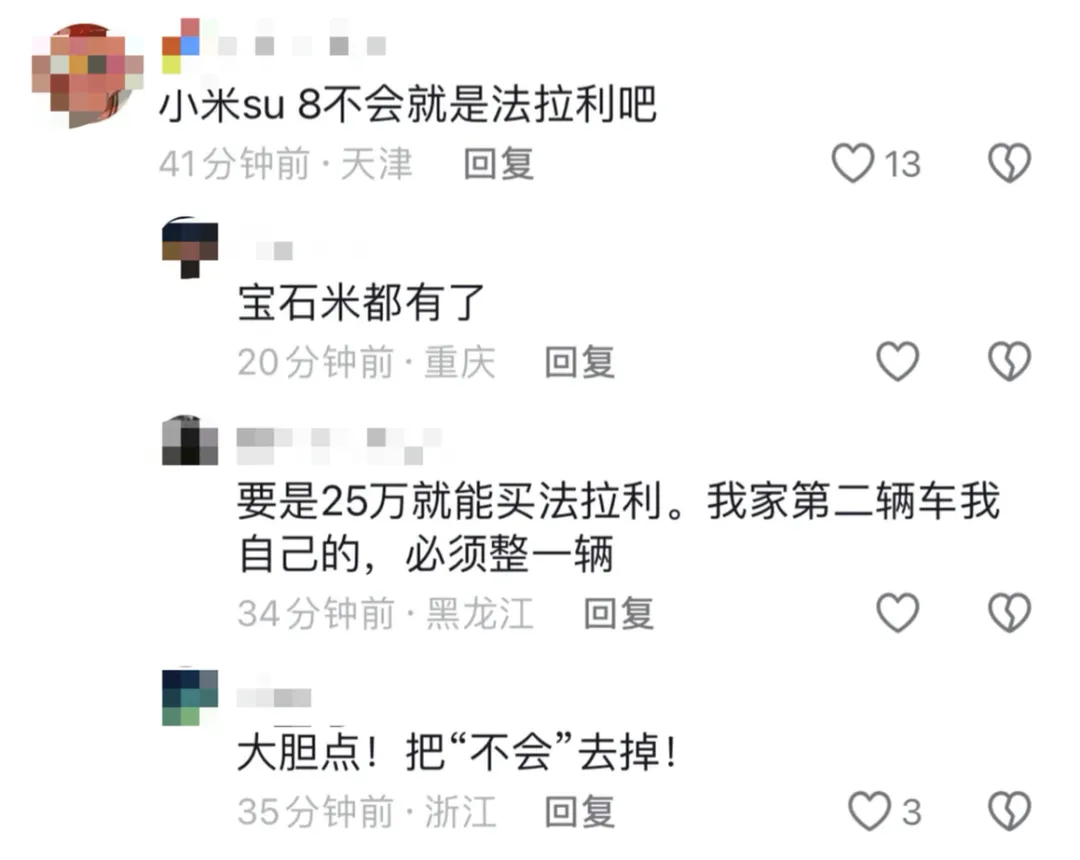 此情景引发了网友的热议,有网友表示:“小米su8不会就是法拉利吧?”“大胆点,把不会去掉”。