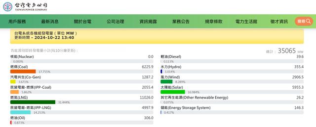台电官网的发电统计显示,目前台湾地区主要依靠火力发电。即使是在风力发电量较大的秋冬季,在太阳能发电量最高的午间时段,燃气、燃煤、燃油等供电量仍超六成。