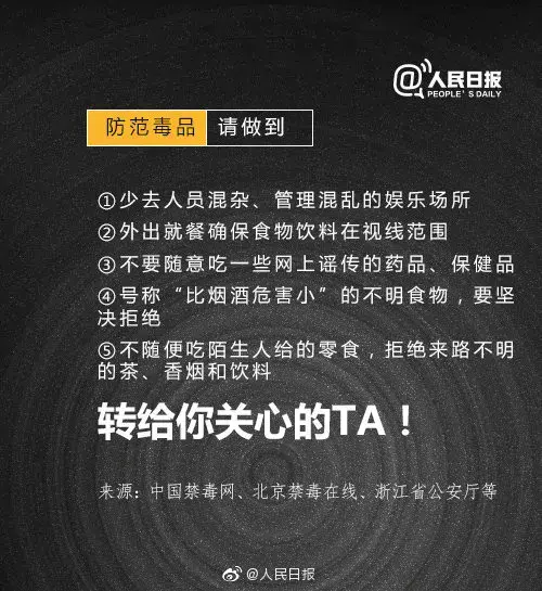 毒品不仅对身体健康造成严重危害,还可能引发其他违法犯罪行为,危害社会安全。大家在娱乐场所时,要提高警惕,不要让饮品远离自己的视线,不吃陌生人提供的食物,以免遭受不法侵害。