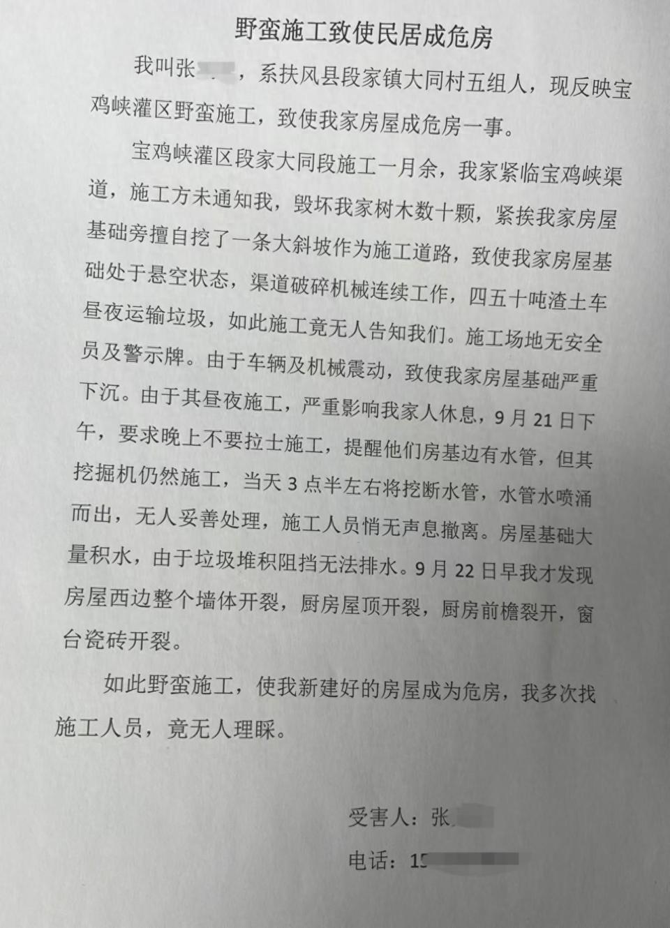 “他们施工在没有通知我家的情况下,毁掉我家树木,挖断自来水管,重载渣土车从墙外通过,破碎机震动,造成我家房子短时间内开裂。”日前,扶风县的张先生反映,因与他家房屋仅数米距离的宝鸡峡河道施工,造成其房屋受到损伤,然而,经与施工方多次交涉维权,均无结果。