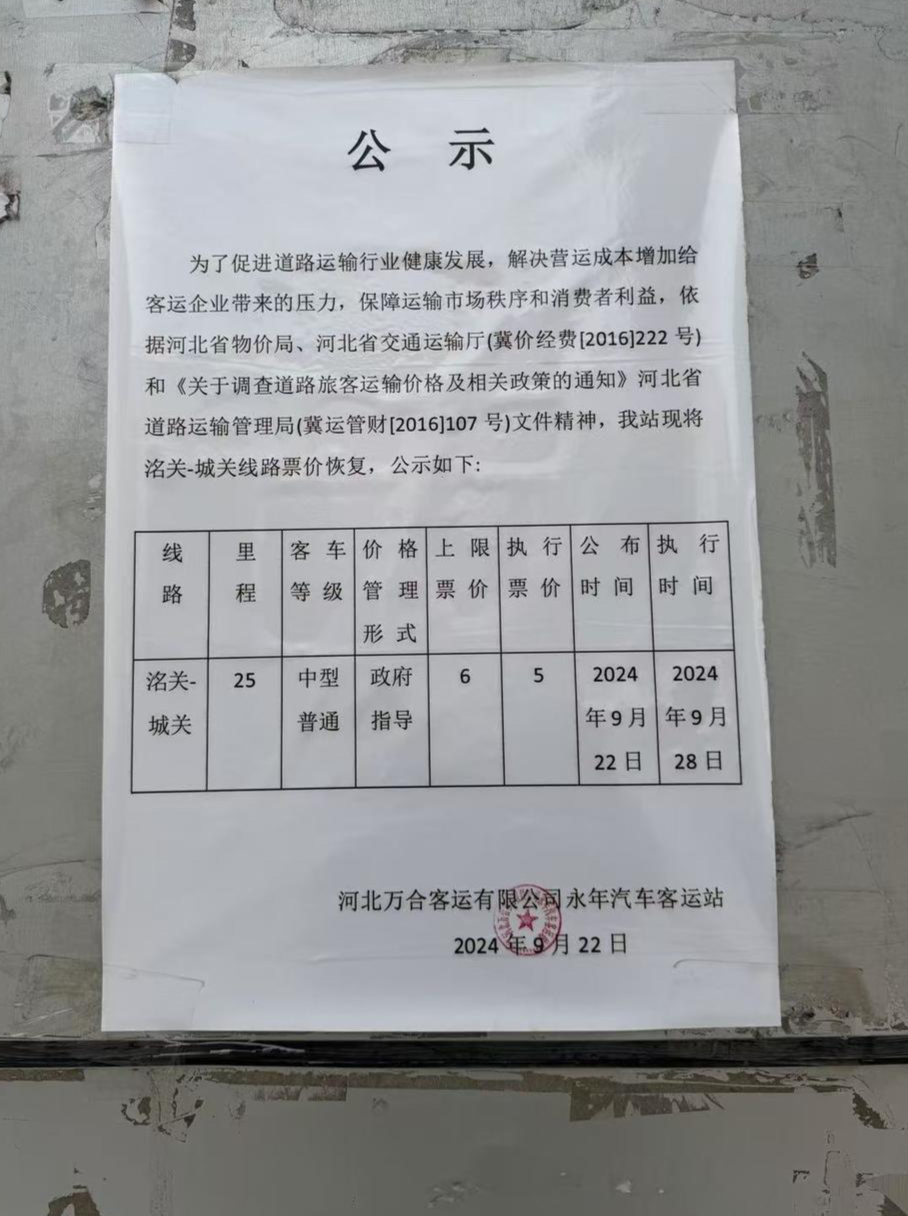 针对涨价问题,红星新闻记者在万合公司永年客运汽车站看到一份公示,该公示称,为解决营运成本增加给客运企业带来的压力,保障运输市场秩序和消费者利益,依据河北省物价局、河北省交通运输厅《关于调查道路旅客运输价格及相关政策的通知》等文件精神,将洺关至城关线路票价恢复至5元。