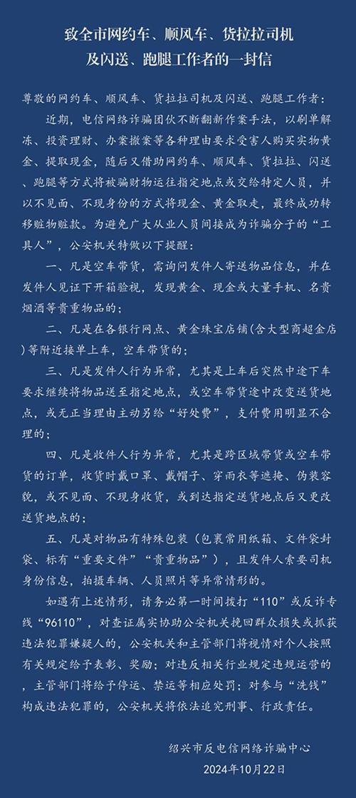 绍兴市反电信网络诈骗中心专门为 网约车、顺风车、货拉拉、闪送、跑腿等工作者写了一封信,提醒大家提高警惕