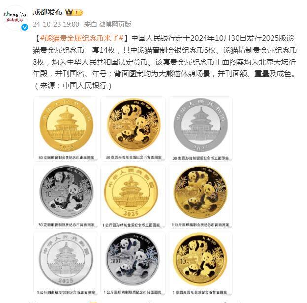 中国人民银行定于2024年10月30日发行2025版熊猫贵金属纪念币一套14枚,其中熊猫普制金银纪念币6枚、熊猫精制贵金属纪念币8枚,均为中华人民共和国法定货币。该套贵金属纪念币正面图案均为北京天坛祈年殿,并刊国名、年号;背面图案均为大熊猫休憩场景,并刊面额、重量及成色。(来源:中国人民银行)