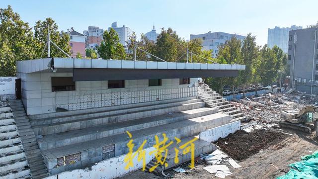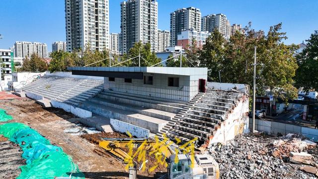 10月23日,记者在济南经十路与营市东街交叉口东北侧的槐荫区体育活动中心体育场附近看到,该体育场四周已经搭建起施工围挡,西侧围墙和北侧部分居民楼已经拆除,施工人员开始对体育场内东侧看台进行分段拆除。