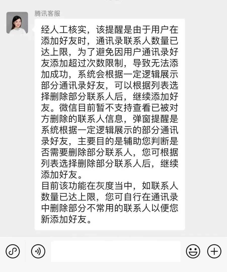 据新京报贝壳财经,就相关功能,腾讯客服对记者表示,“当您的通讯录好友已达到上限后,为避免您在添加好友时无法继续添加,系统会展示部分通讯录好友信息,用于辅助您判断是否需要删除部分联系人,您可以根据列表选择删除部分联系人后,继续添加好友。”