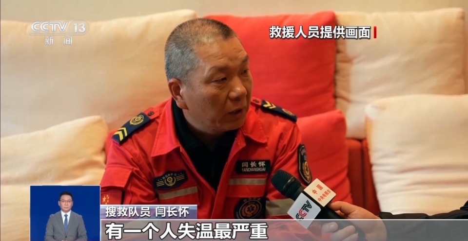 搜救队员 闫长怀:有一个人失温最严重,先把保温毯给裹起来,把担架送上来。当时啥都没有,纯粹靠背下去,也不现实。