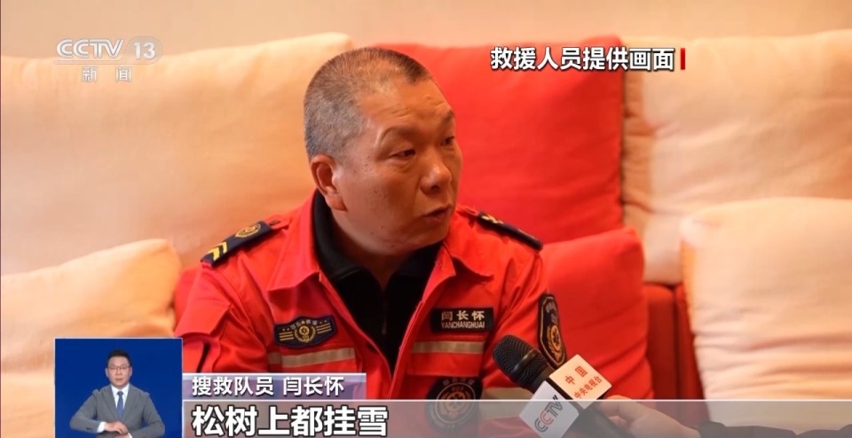 搜救队员 闫长怀:松树上都挂雪,而且是风吹过来的,人都不具备走的条件,反正就硬上去救援。