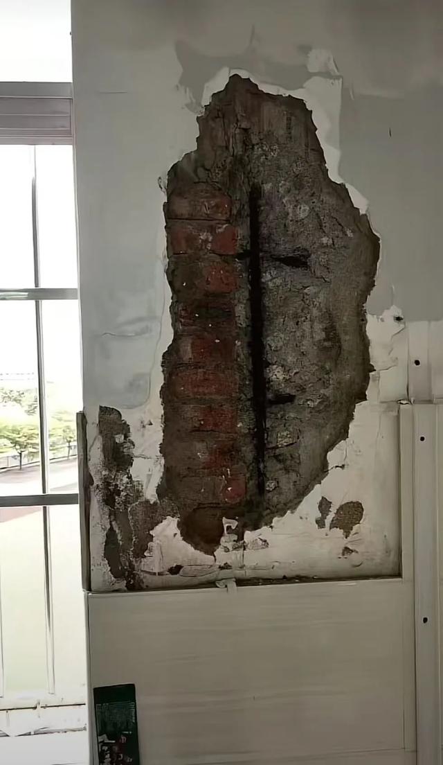 ▲回新逸夫小学的教学楼裸露出砖头和钢筋。受访者供图