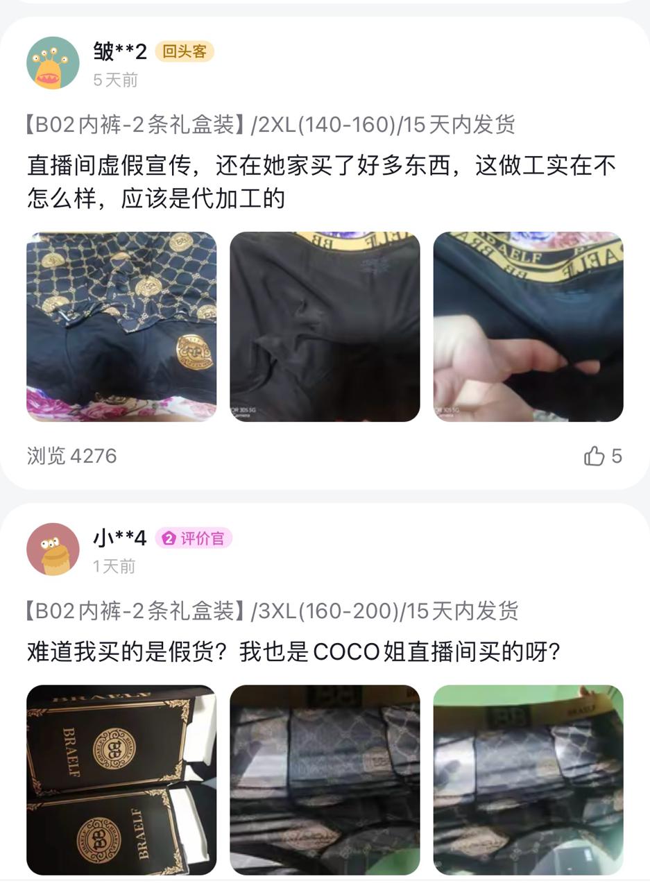 据媒体报道,“澳门COCO姐”直播间的虫草内裤被称为“BB”品牌,内裤上有多个BB、BRAELF(巴莱尔)LOGO,与其售卖的男装属同一品牌。该内裤在宣传页展示里也有很多BB、BRAELF(巴莱尔)的LOGO,但客服称其为“贵茨”品牌。