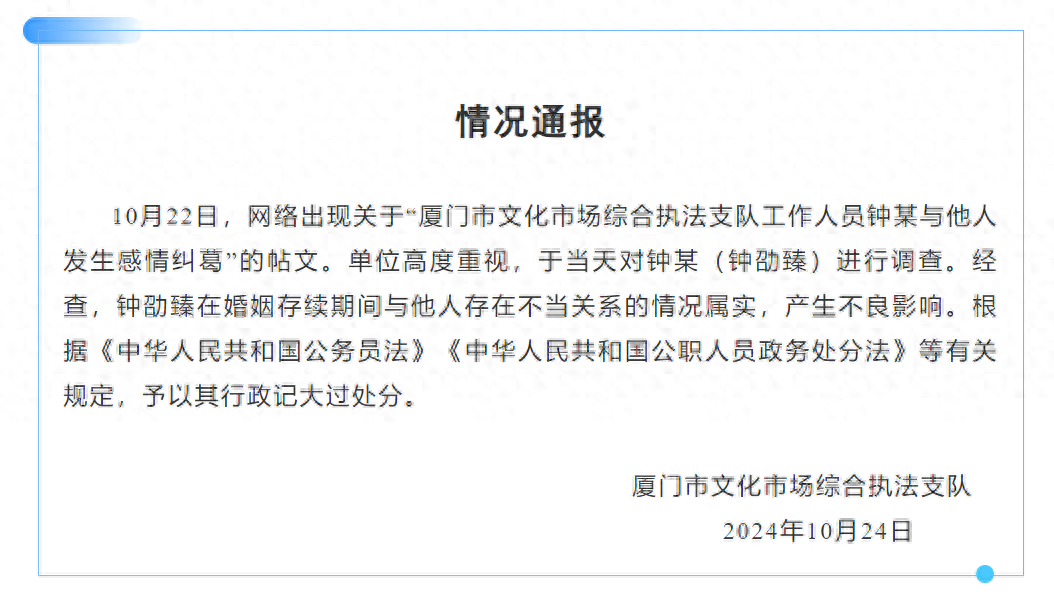 10月24日,福建厦门文化市场综合执法支队发《通报》回应“女子举报干部出轨多人”一事,称情况属实,予以其行政记大过处分。但通报内容被网友质疑回应草率,对是否存在公权私用、挪用公款等未回应。