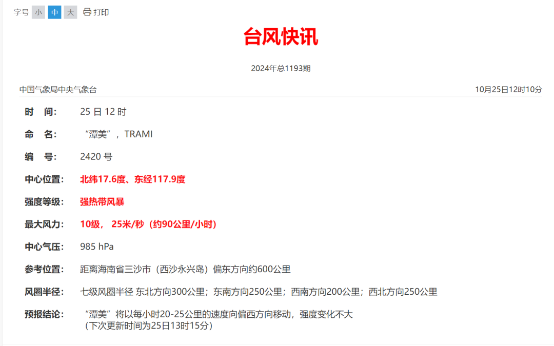 中央气象台今天10时发布了台风黄色预警,今年第20号台风“潭美”今天(10月25日)上午由热带风暴级加强为强热带风暴级,其中心上午12时位于距离海南省三沙市(西沙永兴岛)偏东方向约600公里的洋面上,就是北纬17.6度、东经117.9度,中心附近最大风力有10级(25米/秒),中心最低气压为985百帕,七级风圈半径200—300公里。