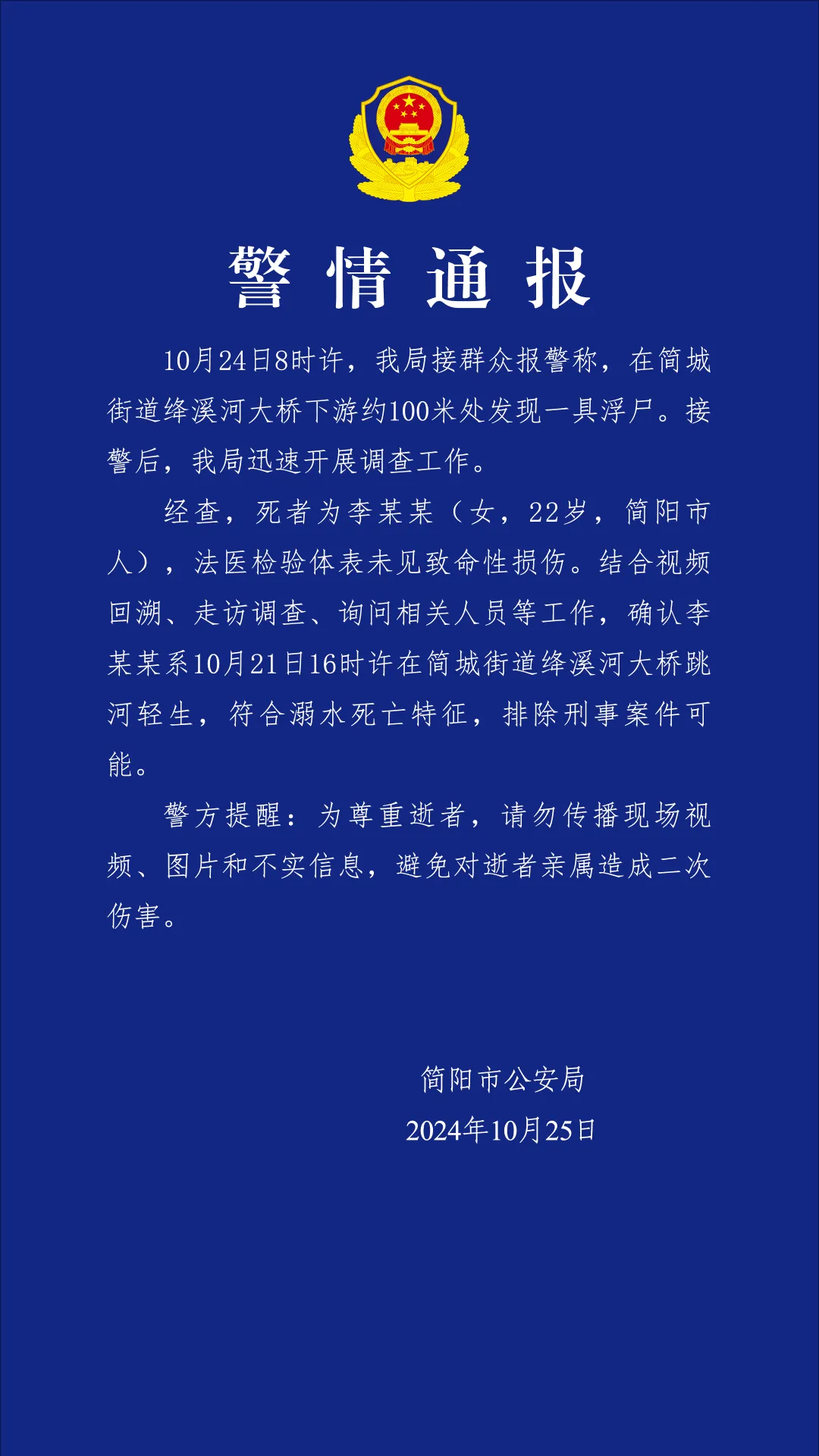 经查,死者为李某某(女,22岁,简阳市人),法医检验体表未见致命性损伤。结合视频回溯、走访调查、询问相关人员等工作,确认李某某系10月21日16时许在简城街道绛溪河大桥跳河轻生,符合溺水死亡特征,排除刑事案件可能。