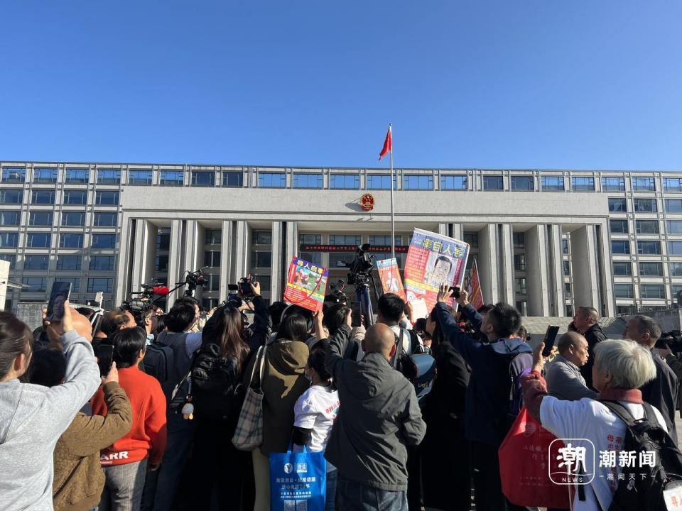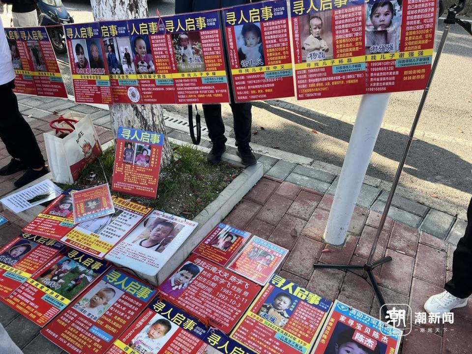 与每次涉及拐卖案件的庭审法院外一样,10月25日重审一审宣判的法院外,全国各地寻亲的母亲父亲子女,都相互簇拥着蹲守在贵阳中院的大门口,等待尽可能多的曝光。潮新闻记者看到,在法院门口的人行道上,地面、围墙整齐摆放和悬挂着红底白字的“寻人启事”牌子,有人甚至一直高举在胸前头顶,就为了争取哪怕一次镜头的关注。