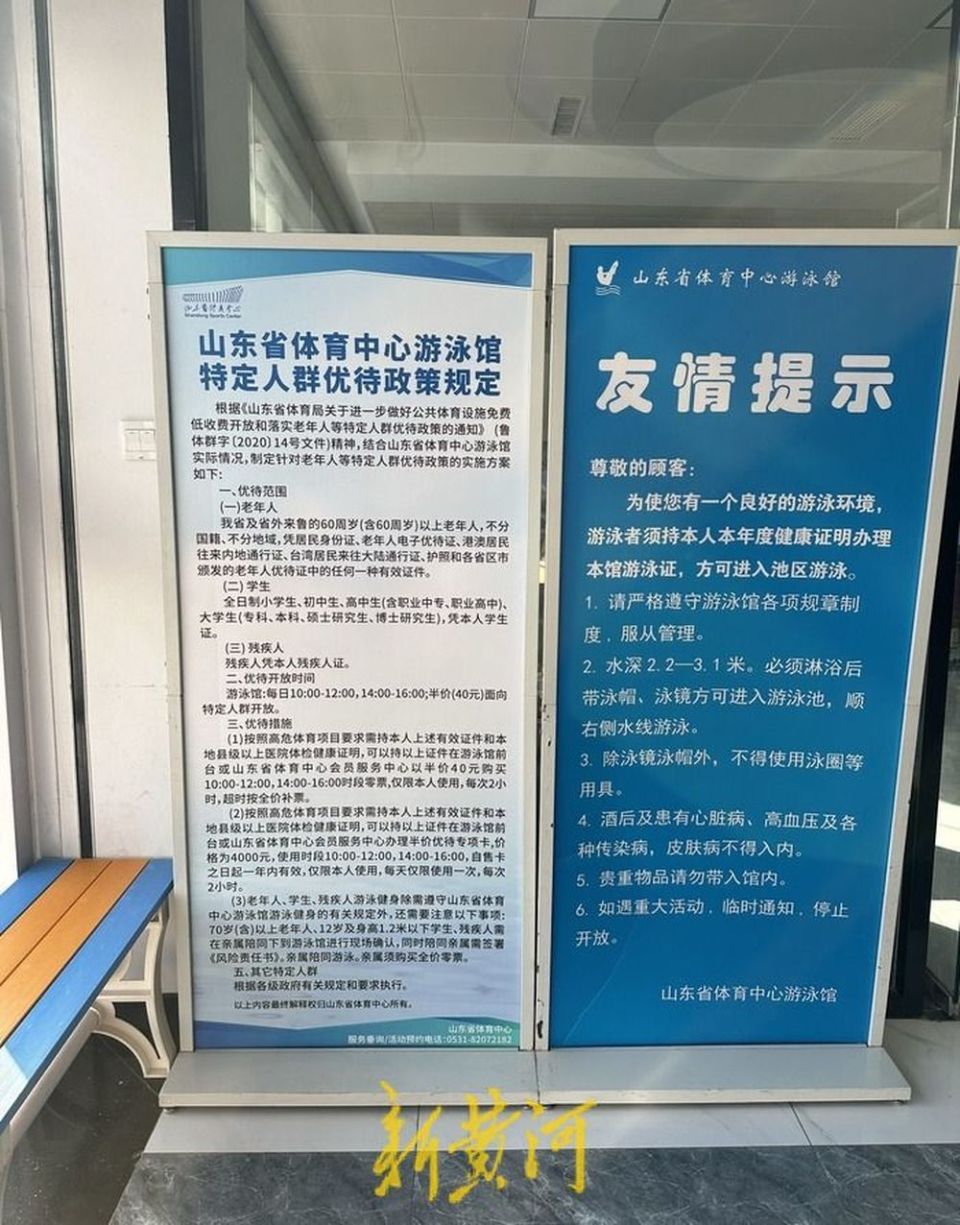记者在走访过程中了解到,公立游泳馆不仅对老年人没有年龄限制,而且还提供优待措施。在山东省体育中心游泳馆入口,记者看到,60周岁(含60周岁)以上老年人凭有效证件和本地县级以上医院体检健康证明可以办理半价优待专项卡。70周岁(含)以上老年人需在亲属陪同下到游泳馆进行现场确认,同时陪同亲属需签署《风险责任书》。
