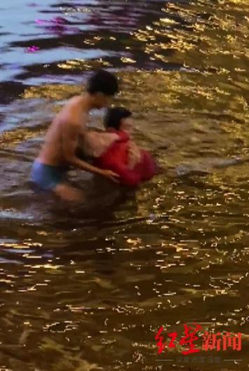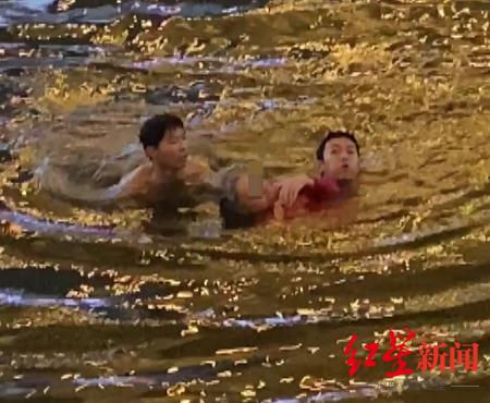 红星新闻记者从视频看到:两名男生相继跳入水里,奋力地朝一名身着红色衣服的溺水者游去。随后,一人位于溺水者头部位置,用手拖住其脖子,尽可能让其面部露出水边,不被呛水;另一人在后侧,用手拖住溺水者背部,让其身体顺势朝岸边靠近。