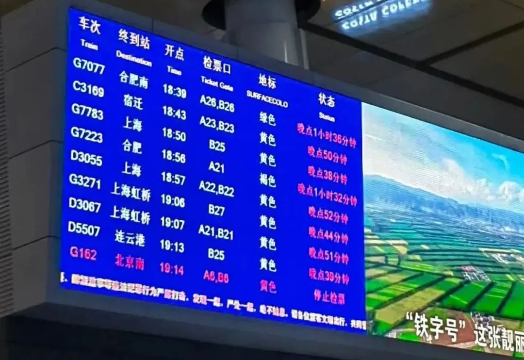 据现代快报报道,通过铁路12306的“车站大屏”功能,记者查询到,晚点车次很多,涉及上海、徐州、郑州等多个方向。