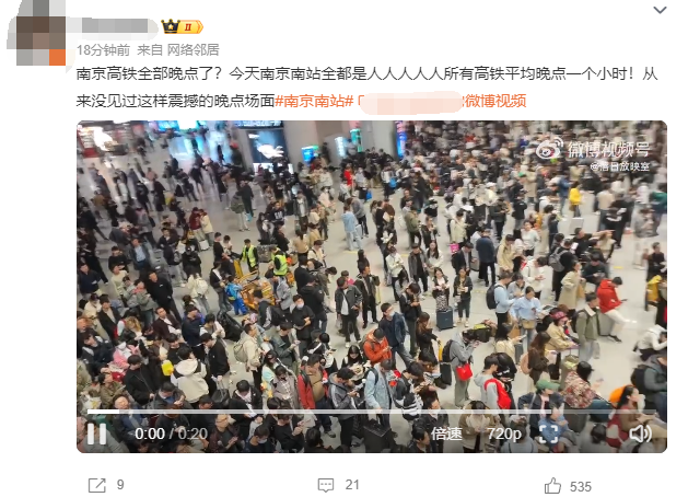 南京南站多趟车次大面积延误